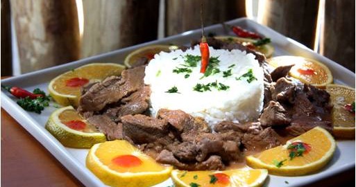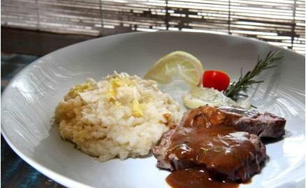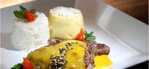 Sobremesa: Entrefolhas – fatias de massa folhada com camadas de creme holandês e chocolate, suspiro e calda de frutas.